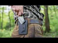 The machined aluminum handle is textured for added grip and less slip while working. A plastic sheath allows for conventional tip down belt carry, or horizontal scout carry.